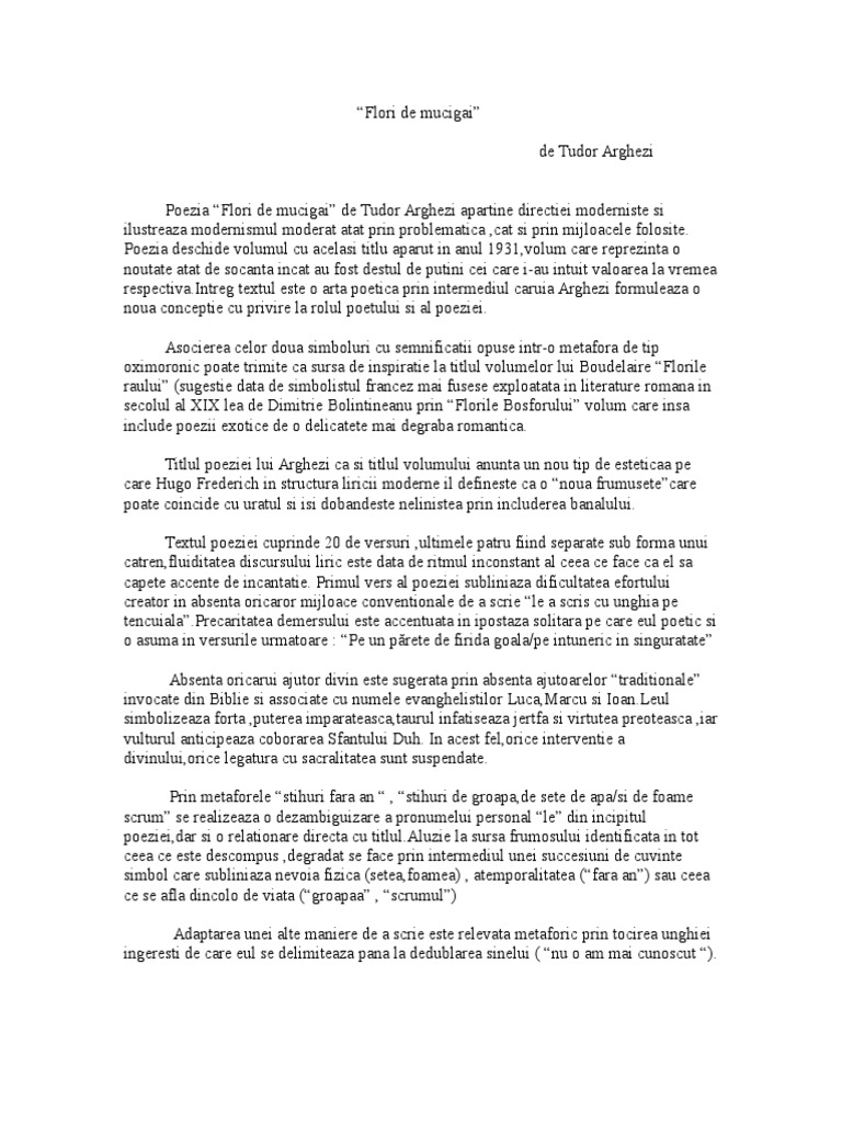 Relevante pentru puterea poeziei de a transforma urâtul în valori estetice prin talentul scriitorului pot fi de exemplu poeziile din volumul flori de mucigai. Referat flori de mucigai tudor arghezi pentru gimnaziu. Surse de inspiratie pot fi identificate trei surse de inspiratie pentru psalmii arghezieni experienta personala a autorului in perioada 1899 1905 arghezi este monah la cernica cei 151 de psalmi biblici apartinand noului testament atribuiti lui david si lucrarea lui dosoftei psaltirea pre versuri tocmita 1673 care ofera traducerea si versificarea inedita a imnurilor biblice. Titlul constituie motivul central dar și intriga piesei.
