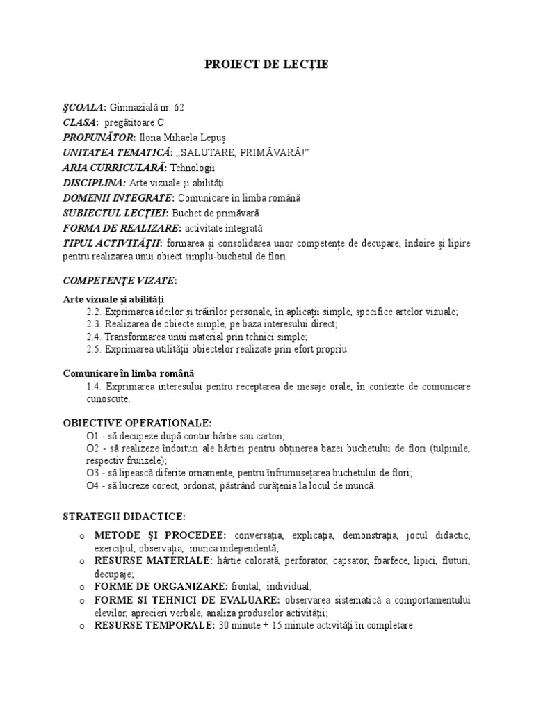 Acest proiect trateaza proiect de lectie flori de primavara. învăţământ primar abilităţi practice educaţie tehnologic ă. Mai jos poate fi vizualizat un extras din document aprox. Formare de priceperi și deprinderi competențe generale.